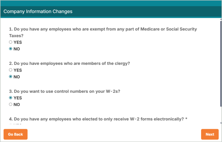 This screen asks questions that allow the system to effectively verify your data based on your filing needs. In most cases you should say NO to the questions unless you have employees who meet one of the listed conditions.
