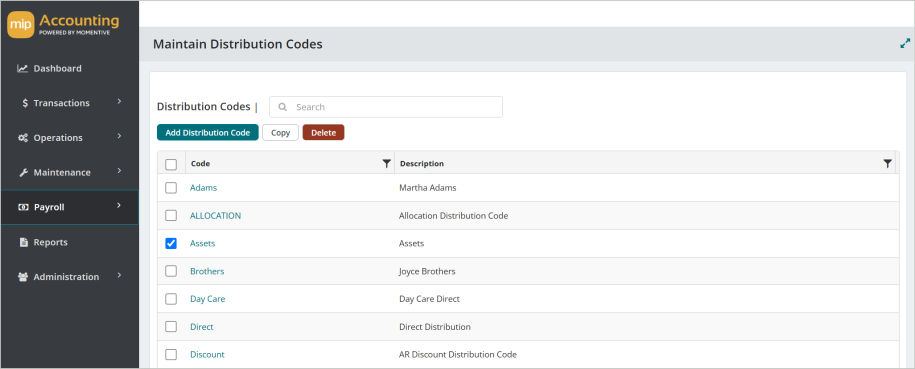 You can create an exact duplicate of an existing distribution code. Simply select the distribution code to copy from and enter a new name to copy to. Once you select Copy, you'll be taken to the distribution code record where you can make any necessary changes.