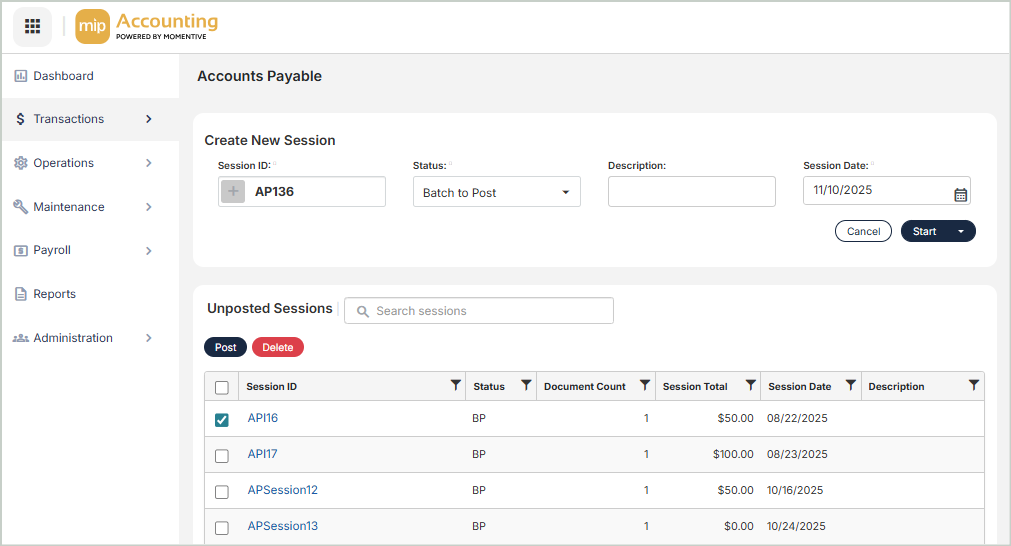 Post - To post a session, select it from the grid, then select Post. You can only post sessions that have a status of BP.