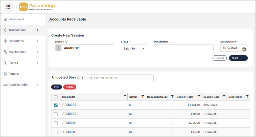 Sessions are used to group related transaction documents. When a session is posted, all documents in the session are processed together. You must create or open a session in order to enter documents or transactions.