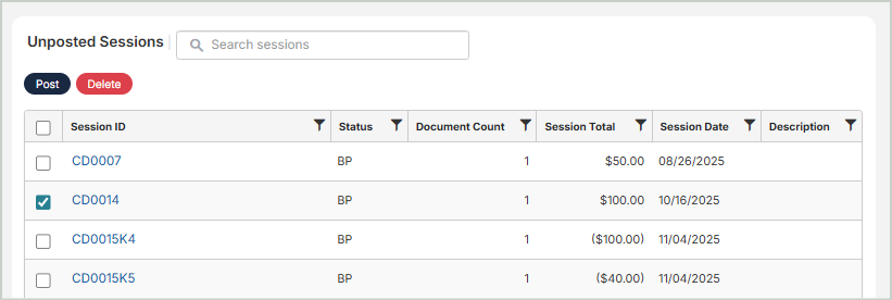 Post - To post a session, select it from the grid, then select Post. You can only post sessions that have a status of BP.
