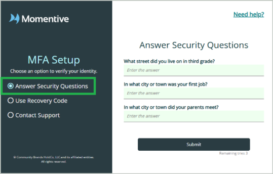 Option A - Answer the security questions that you created when you first set up MFA. If you can't remember the answers to your questions, you can enter your recovery code instead (Option B below).