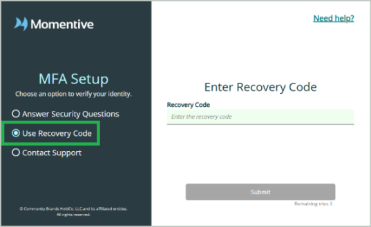 Option B - Enter the Recovery Code that was generated for you when you first set up MFA. If you don't have your recovery code, you can contact support to help you recover your account (Option C below).