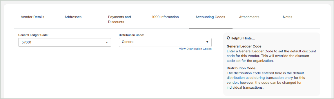 Use the Accounting Codes tab to set the default accounting codes for transactions. The system applies these codes to entries involving this vendor.