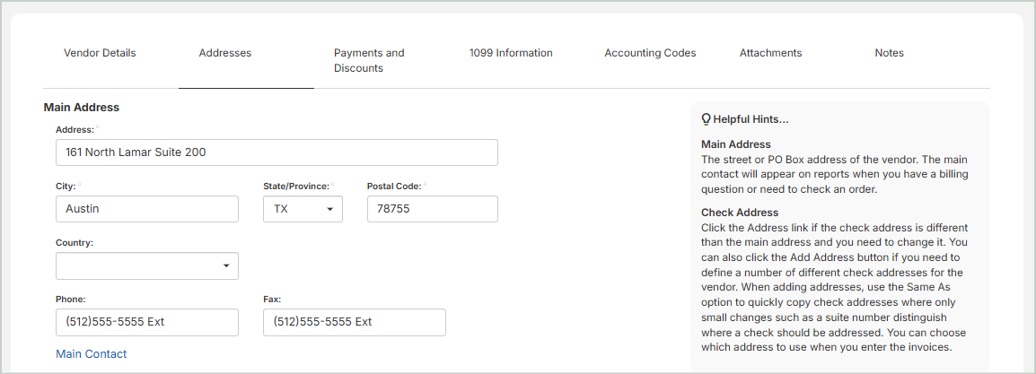 Hold Payments: Select this option to hold payments to this vendor. When a vendor is on hold, the system will not generate checks for them. You can still create and link invoices, but checks - including system-generated ones - will not be printed. If you attempt to enter a manual AP check for a vendor on hold, a warning message will appear, but you can choose to proceed. Note that invoices can still be created and linked to the vendor but checks will not be printed.