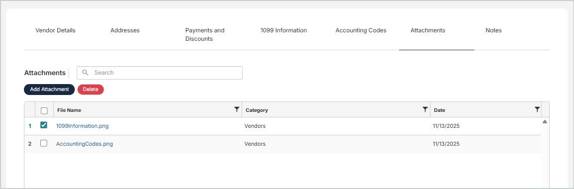 Use the Attachments tab to quickly attach related documentation to a vendor record.