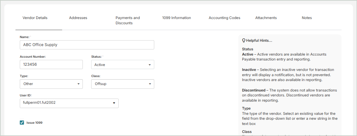 Issue 1099: Select this option if the vendor is 1099-eligible, otherwise leave it blank.