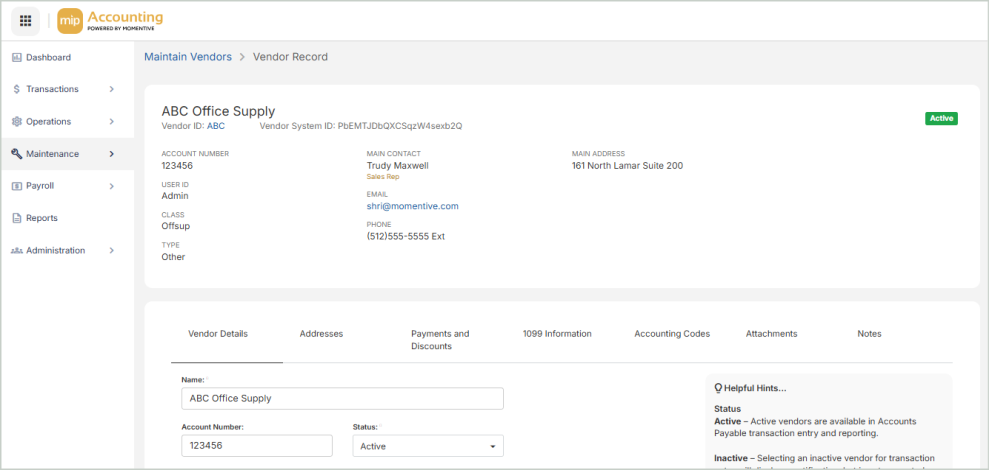 View & update details for a vendor, including contact information, payment terms, and accounting codes.