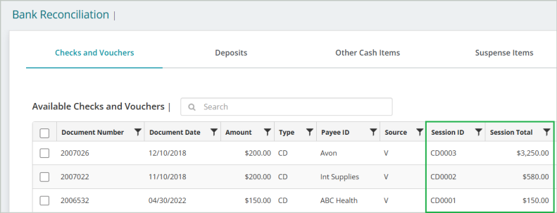 We’ve added two new columns to the Bank Reconciliation form - Session ID and Session Total. These columns are available in Modern under the Checks and Vouchers and All Items tabs so you can easily identify Auto Payment records across multiple sessions. These columns are also available in Classic under the Checks and Vouchers tab.
