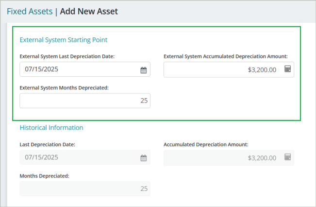 You can now capture external depreciation history when adding a new asset in MIP Classic & Modern. We've added three new fields under the Depreciation section that let you record the depreciation history of an asset from a system outside of MIP. The values entered in these fields automatically populate the Historical Information section (now read-only), ensuring that MIP accurately reflects the asset’s full depreciation history.