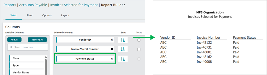 We’ve added a new Payment Status column to the Accounts Payable > Invoices Selected for Payment Report. This provides greater visibility into the status of your invoice payments directly within the report (e.g. Submitted, In Process, Error, Paid).