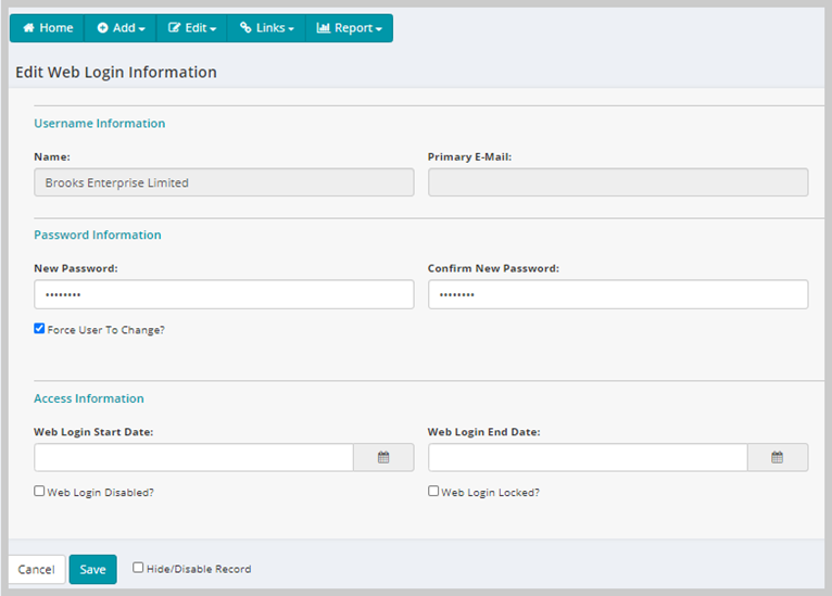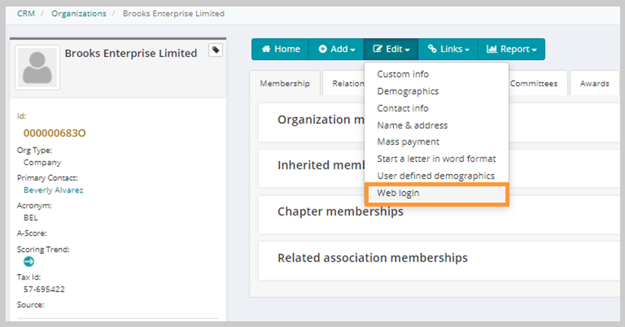 The Web Login drop-down link on the Edit profile menu tab of the Organization profile opens the Edit Web Login Information form in which you can update web login settings for the organization.